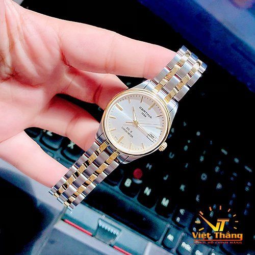 Với size mặt 30mm, C033.251.22.031.00khá vừa vặn với cổ tay của số đông phụ nữ Việt Nam. Bộ kim và các cọc số dạng vạch thanh mảnh với lớp mạ vàng sang trọng và bắt mắt. Điểm nhấn đáng chú ý nhất tới từ dòng chữ Chronometer ở góc 6h. Đây là sự chứng nhận của COSC về mức độ chính xác của cỗ máy quartz phía bên trong của C033.251.22.031.00. Cỗ máy điện tử này cho độ chính xác gấp 8 lần so với những cỗ máy quartz thông thường. Bên cạnh đó, với tính năng End of life, kim giây của đồng hồ sẽ nhảy cóc để cảnh báo cho chủ nhân khi viên pin phía trong gần cạn năng lượng.