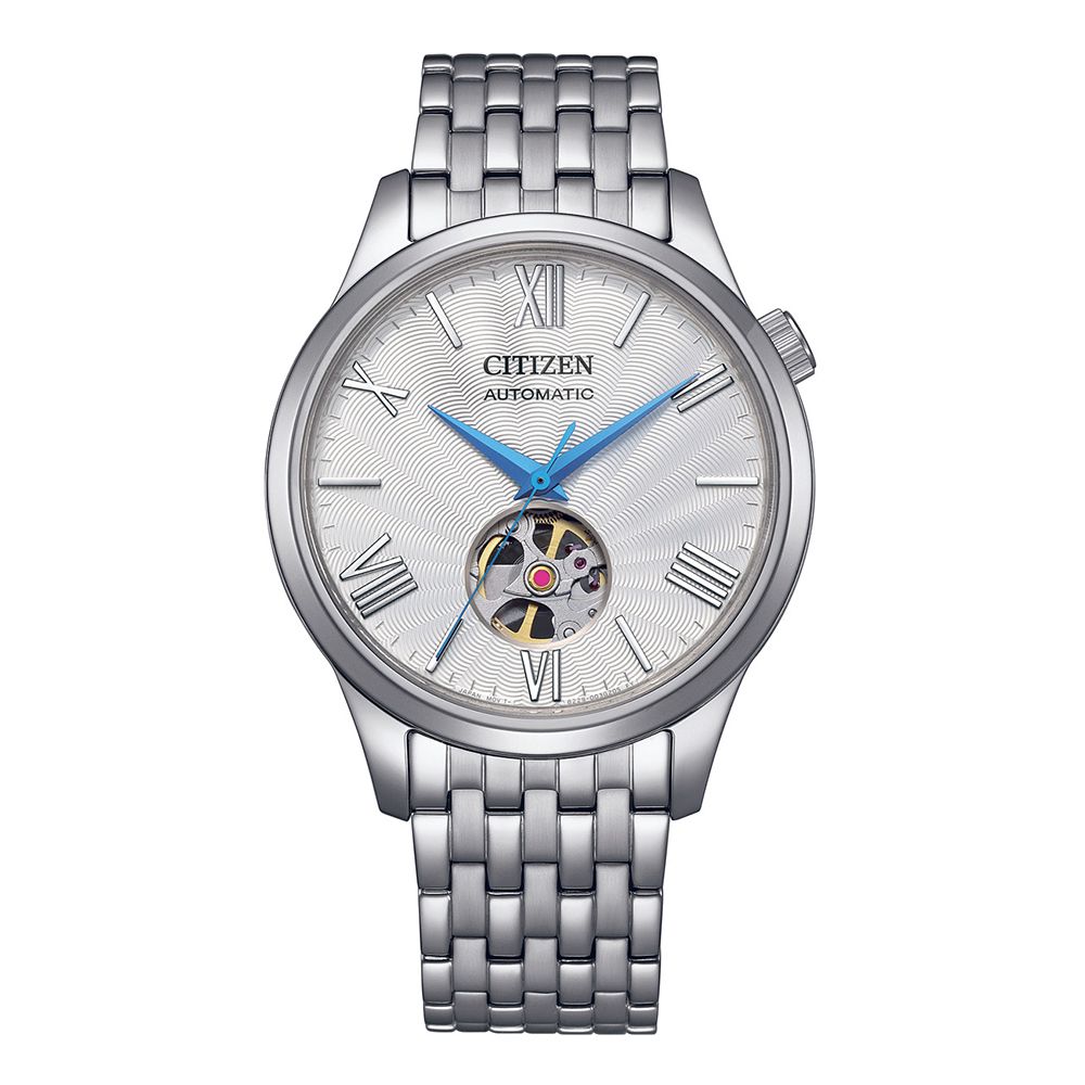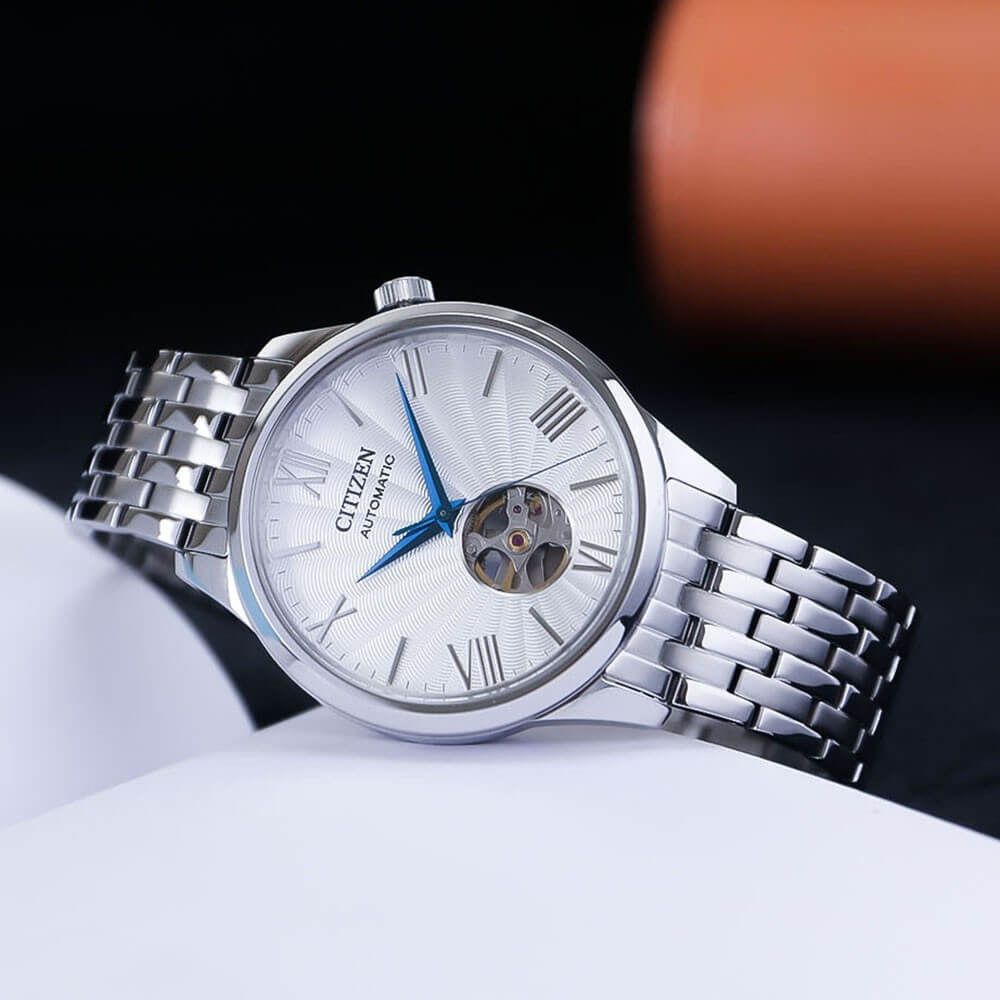 Mẫu Citizen NH9130-84A thiết kế Open Heart (cơ lộ tim) tại vị trí 9 giờ, tạo nên vẻ độc đáo nổi bật trên nền mặt số trắng kích thước 41mm.