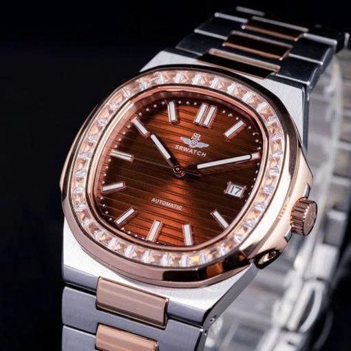 Đồng hồ nam automatic SRWATCH SG88806.1205AT mặt oval,vỏ màu vàng hồng và dây demi được gia công tỉ mỉ từ thép không gỉ kết hợp mạ vàng bằng công nghệ PVD cao cấp,mặt đồng hồ màu nâu được bao quanh bởi những viên đá trắng càng làm tăng thêm vẻ nổi bật.