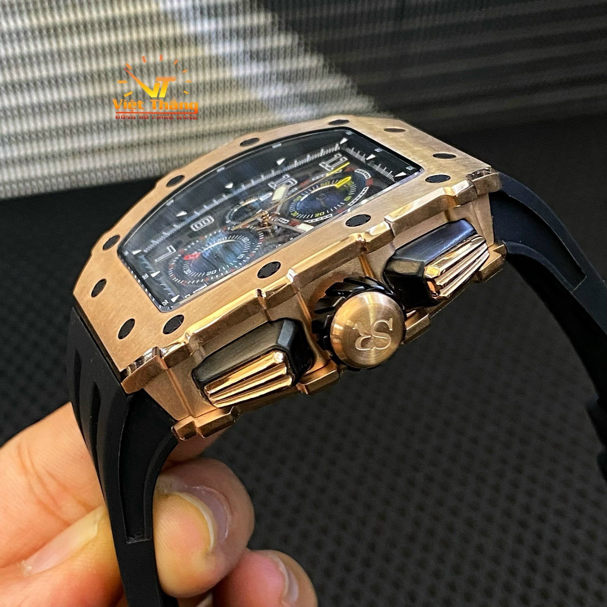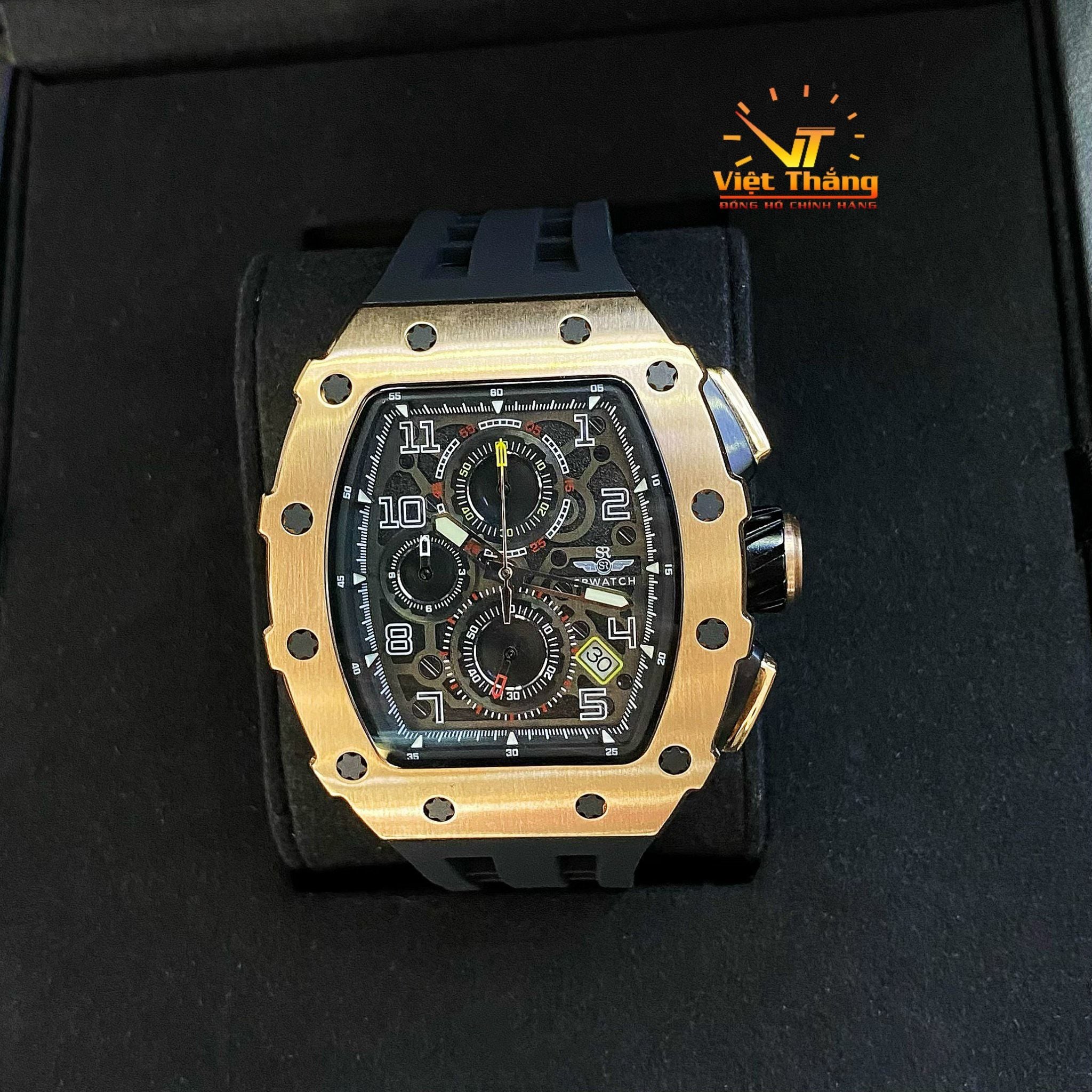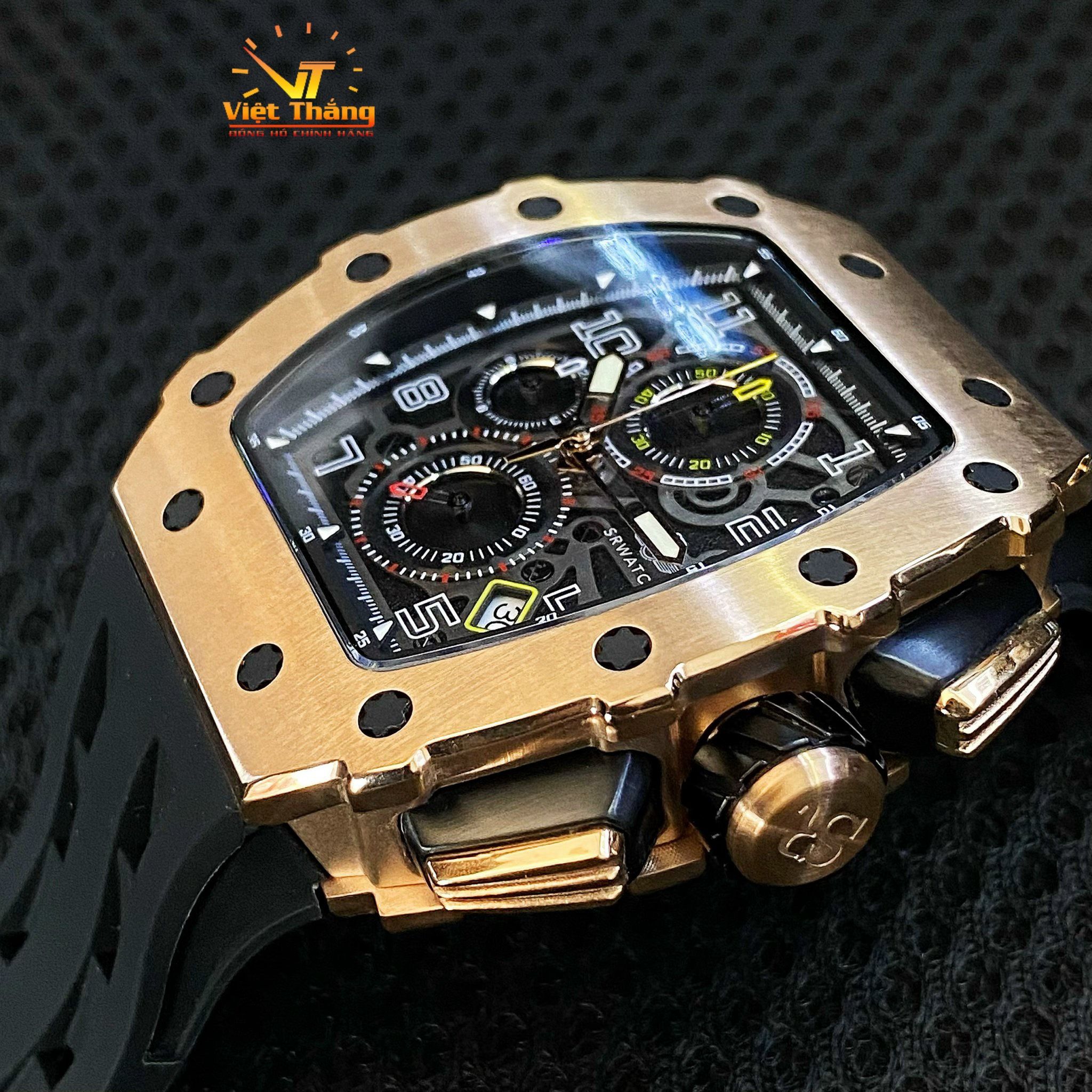 Đồng hồ nam SRWATCH SG88881.4901SP mặt đồng hồ thiết kế thể thao hiện đại. Vỏ đồng hồ được mạ vàng Công Nghệ PVD, gia công tỉ mỉ với các điểm nhấn là ốc hình sao 6 cạnh bao quanh mặt với độ hoàn thiện cao tạo nên sự mạnh mẽ. Dây đeo bằng cao su co giản tạo sự thoả mái. Đồng hồ có 3 kim chính cơ bản hiện thị giờ, phút, giấy. Đồng hồ có chức năng chronograph (giờ, phút, giây) thể thao thể hiện bằng 3 mặt đồng hồ nhỏ trung tâm. Kèm theo cửa sổ lịch ngày thuận tiện cho việc sử dụng. Mặt kính sapphire chống xước cao cấp, đạt tiêu chuẩn chống nước 5ATM, đảm bảo sự an tâm cho người đeo.