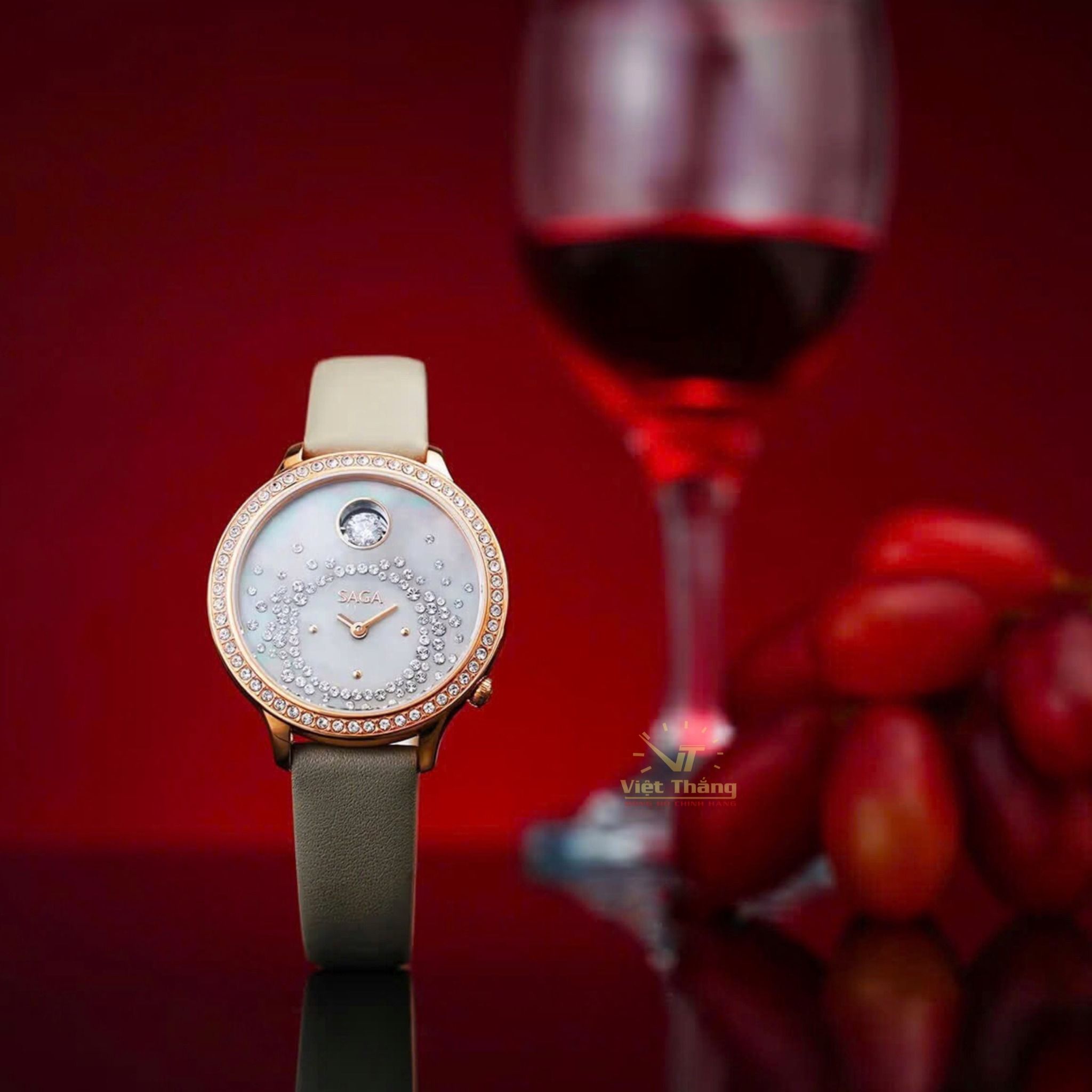 Saga 53766-GPZMGGE-2 – Nữ – Kính cứng – Quartz (Pin) – Đá Swarovski lấp lánh – Mặt số pha lê lộng lẫy – Dây da quyền quý