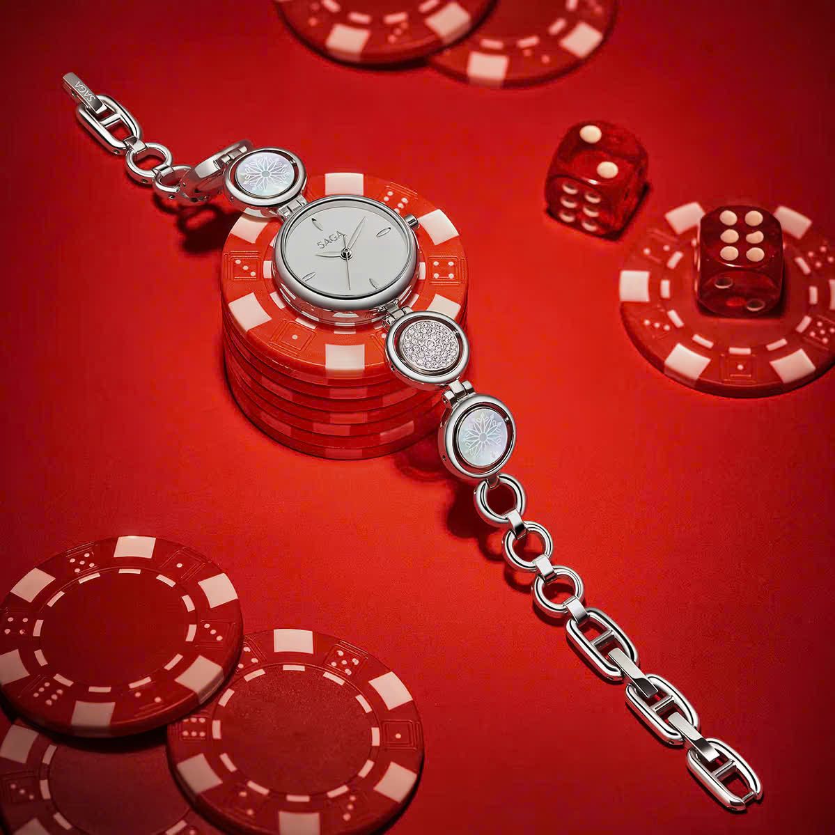 Saga Flip Life 54297-SVWTSV-2 – Biểu tượng của sự may mắn luôn thường trực bên cạnh phái đẹp. Ý tưởng từ vòng tuần hoàn tự nhiên đầy mê hoặc, khơi gợi sức mạnh nội tại bên trong. Kết hợp chất liệu quý giá tạo nên vẻ đẹp không phai. Một mặt khắc bằng laser với họa tiết bông tuyết, mặt còn lại được lát dày đặc 43 viên pha lê.