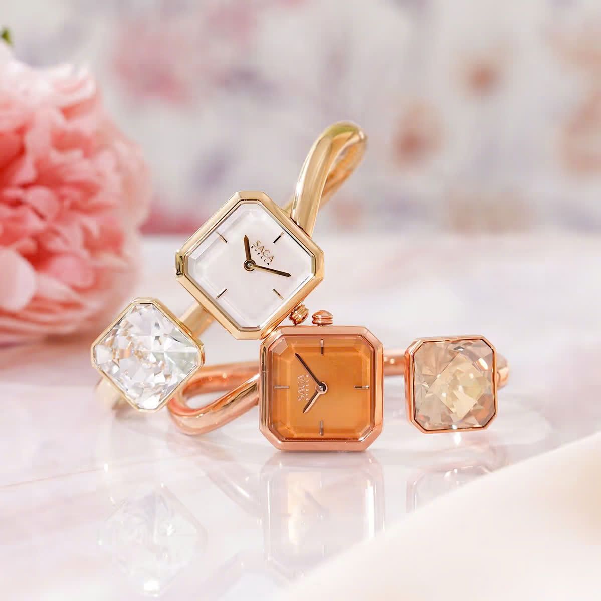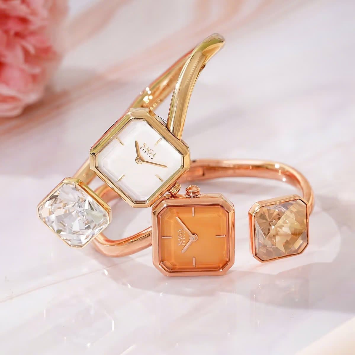 Mẫu Saga 80737-RGBNRG-2S mặt số vuông phiên bản tone màu vàng xà cừ thời trang kết hợp cùng thiết kế đơn giản 2 kim trẻ trung cho phái đẹp.