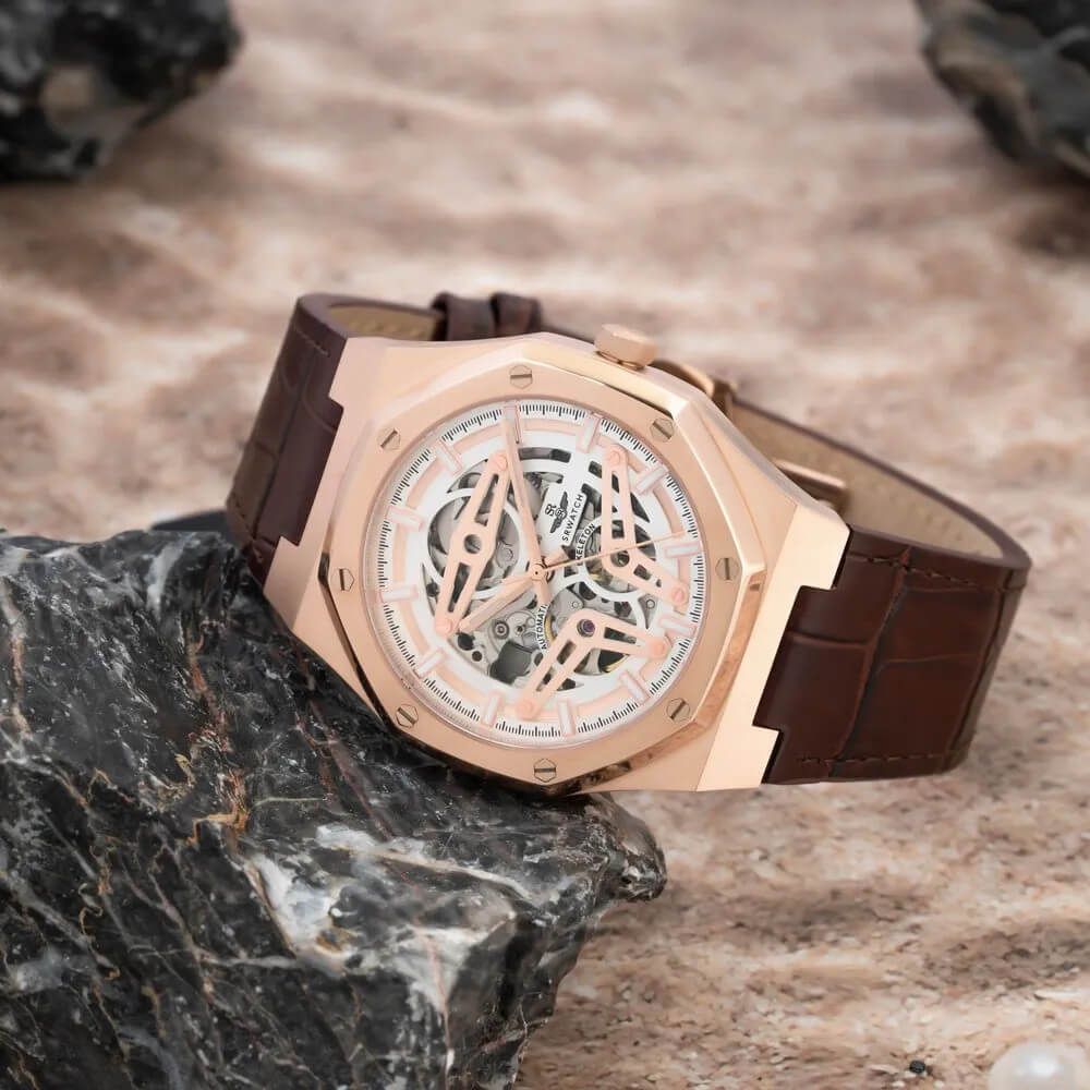 -Chất liệu vỏ: Thép không gỉ Stainless Steel 316L mạ vàng hồng công nghệ PVD